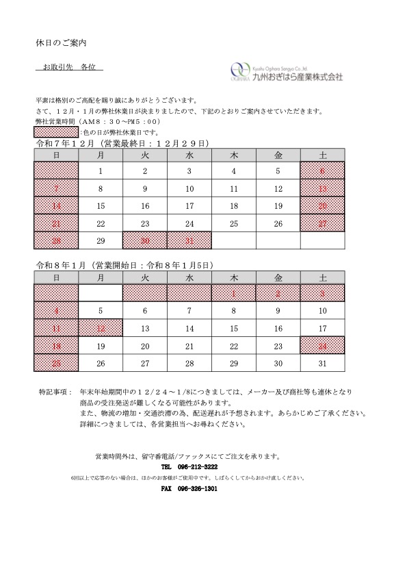 年末年始期間中の12/24~1/8につきましては、メーカー及び商社等も連休となり